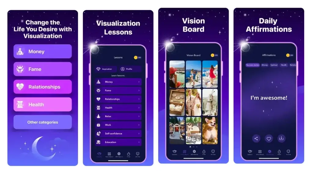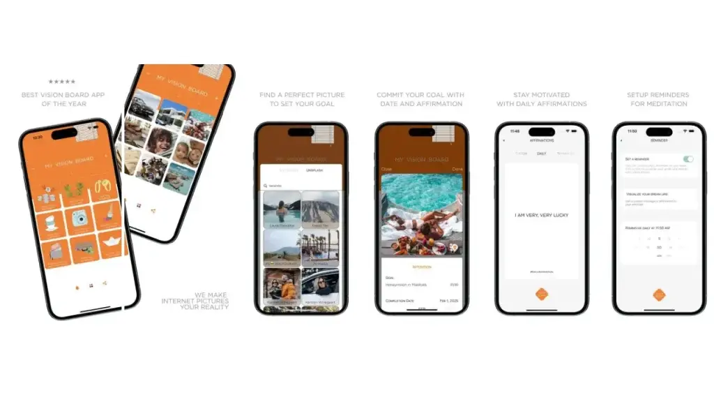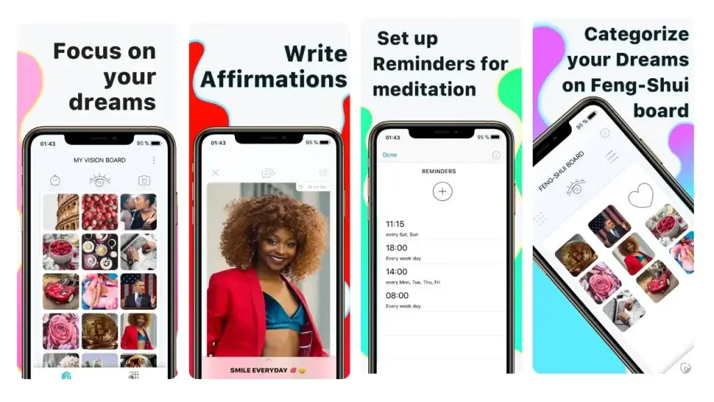A digital vision board combines images, words, and affirmations that represent the life you want to create. Often referred to as a dream board or mind movie, it acts as a daily visual reminder of your intentions and long-term goals. Modern apps expand this concept with features such as affirmations, reminders, and interactive tools that help maintain motivation and focus.